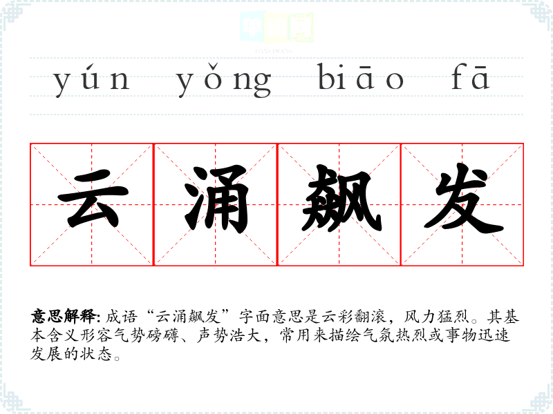 成语“云涌飙发”字面意思是云彩翻滚,风力猛烈。其基本含义形容气势磅礴、声势浩大,常用来描绘气氛热烈或事物迅速发展的状态。