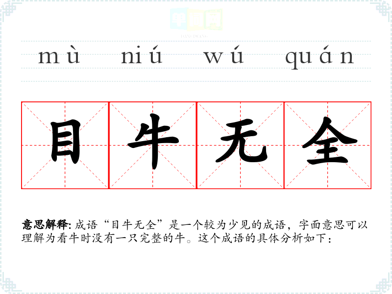 “目牛无全”字面意思是“看牛时没有一只完整的牛”,引申义为事物的不完美或缺陷。它可以用来形容某个事物或情况的不足之处,强调缺失的部分。