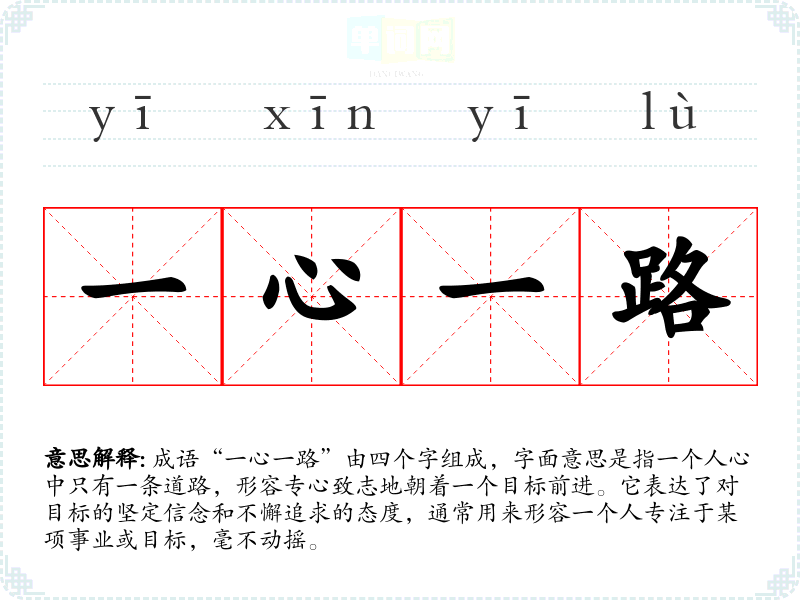 成语“一心一路”由四个字组成,字面意思是指一个人心中只有一条道路,形容专心致志地朝着一个目标前进。它表达了对目标的坚定信念和不懈追求的态度,通常用来形容一个人专注于某项事业或目标,毫不动摇。