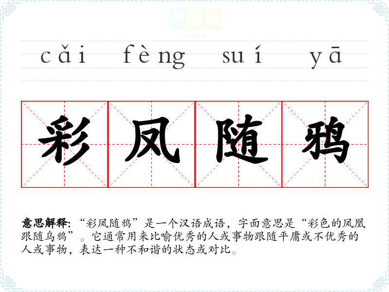 “彩凤随鸦”是一个汉语成语,字面意思是“彩色的凤凰跟随乌鸦”。它通常用来比喻优秀的人或事物跟随平庸或不优秀的人或事物,表达一种不和谐的状态或对比。