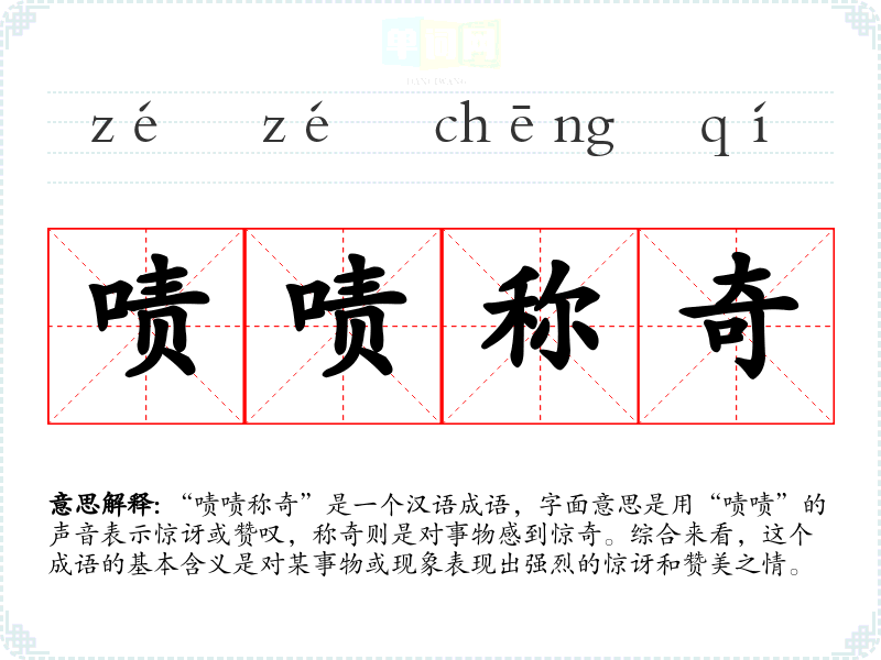 “啧啧称奇”是一个汉语成语,字面意思是用“啧啧”的声音表示惊讶或赞叹,称奇则是对事物感到惊奇。综合来看,这个成语的基本含义是对某事物或现象表现出强烈的惊讶和赞美之情。