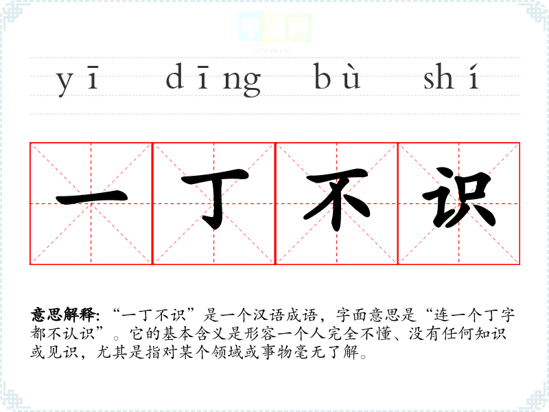 “一丁不识”是一个汉语成语,字面意思是“连一个丁字都不认识”。它的基本含义是形容一个人完全不懂、没有任何知识或见识,尤其是指对某个领域或事物毫无了解。