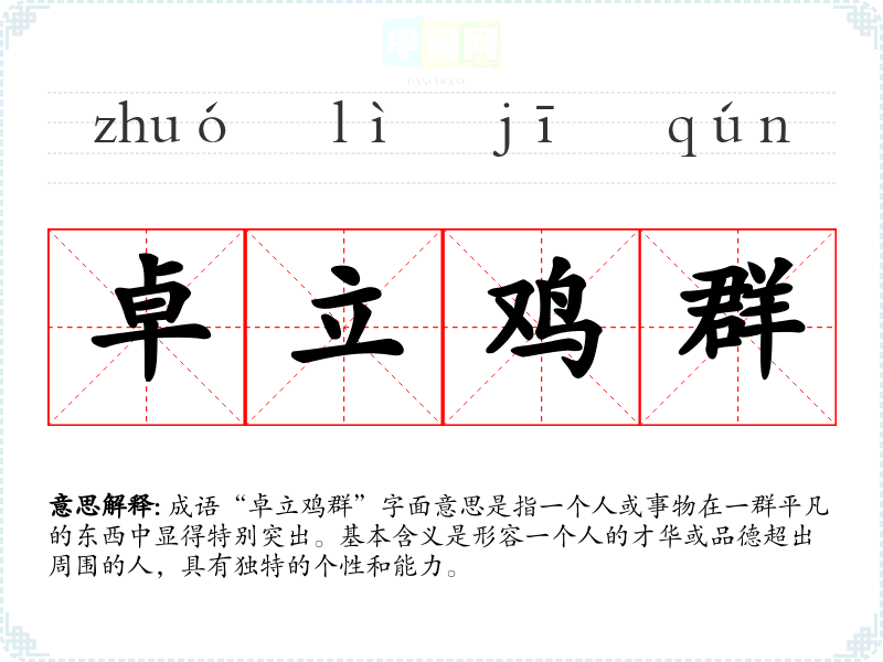 成语“卓立鸡群”字面意思是指一个人或事物在一群平凡的东西中显得特别突出。基本含义是形容一个人的才华或品德超出周围的人,具有独特的个性和能力。