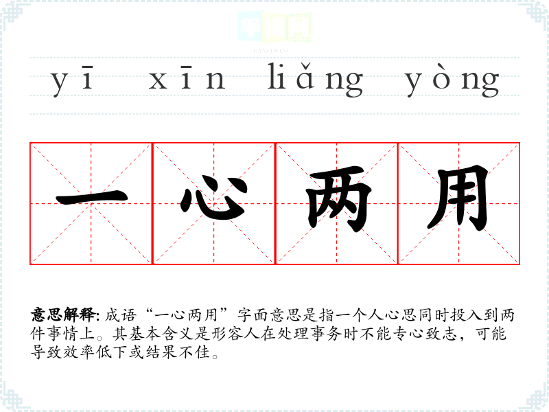 成语“一心两用”字面意思是指一个人心思同时投入到两件事情上。其基本含义是形容人在处理事务时不能专心致志,可能导致效率低下或结果不佳。