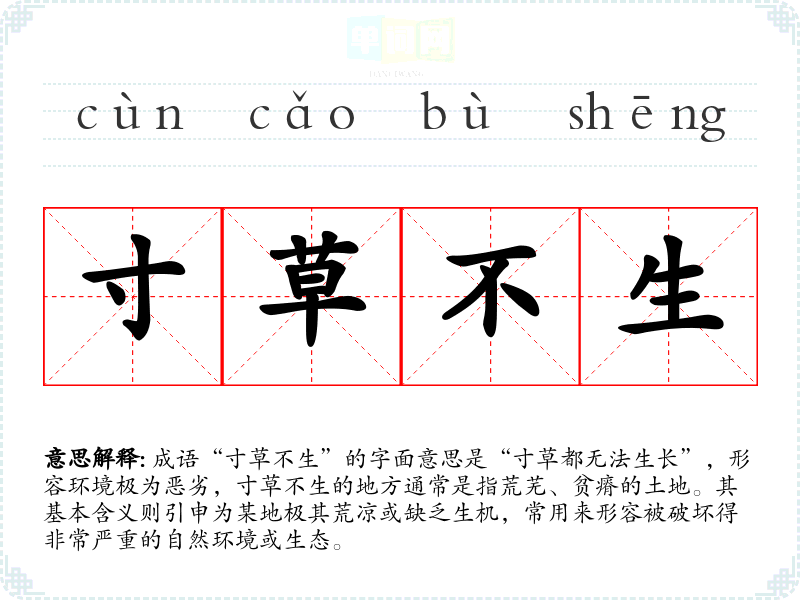 成语“寸草不生”的字面意思是“寸草都无法生长”,形容环境极为恶劣,寸草不生的地方通常是指荒芜、贫瘠的土地。其基本含义则引申为某地极其荒凉或缺乏生机,常用来形容被破坏得非常严重的自然环境或生态。