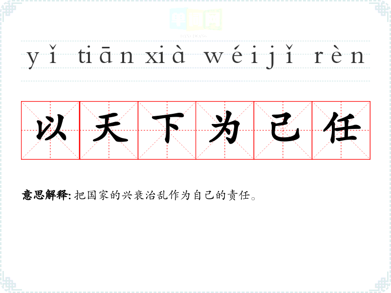 | 以天下为己任 | 把国家的兴衰治乱作为自己的责任。 |