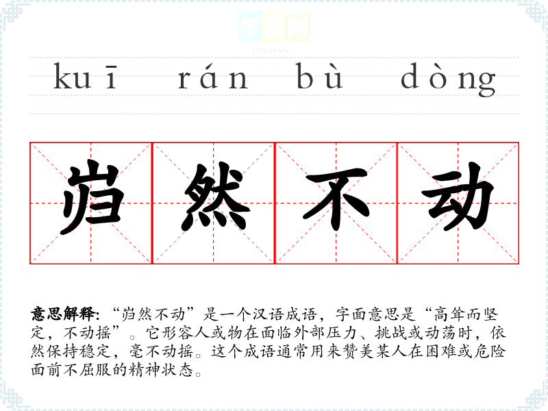 “岿然不动”是一个汉语成语,字面意思是“高耸而坚定,不动摇”。它形容人或物在面临外部压力、挑战或动荡时,依然保持稳定,毫不动摇。这个成语通常用来赞美某人在困难或危险面前不屈服的精神状态。