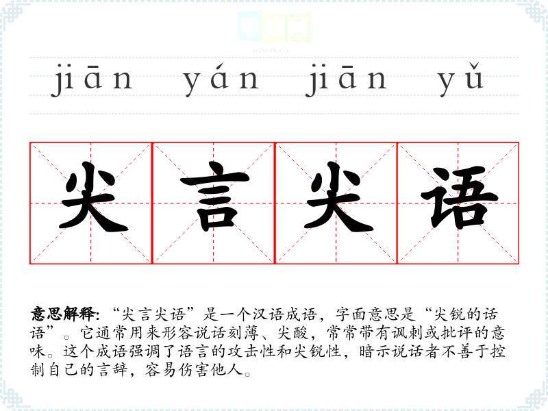 “尖言尖语”并没有明确的历史典故来源,但它的构成可以追溯到古代汉语中对言辞的描述。类似的表达在古代文献中常见,反映了对言辞犀利、直白的品评。在古代社会中,言辞的使用常常与个人的品德和修养相联系,尖酸的言辞往往被视为不良表现。