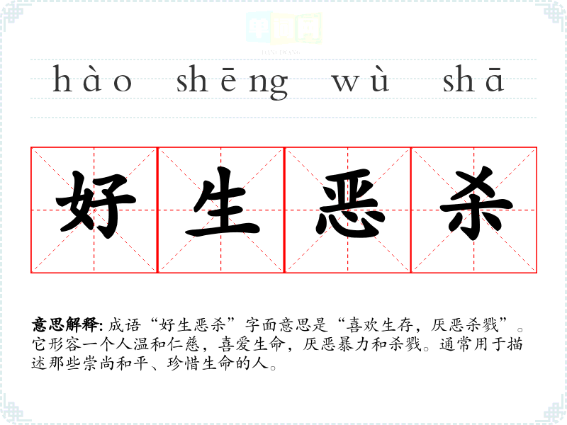 - 这些成语则描述了对生命的漠视和对暴力的推崇,正好与“好生恶杀”相对立。