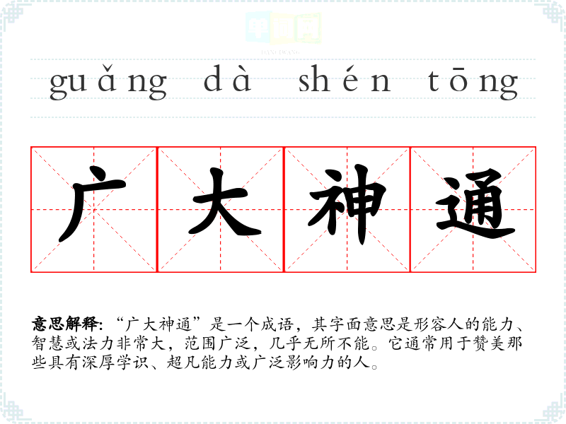 “广大神通”是一个成语,其字面意思是形容人的能力、智慧或法力非常大,范围广泛,几乎无所不能。它通常用于赞美那些具有深厚学识、超凡能力或广泛影响力的人。