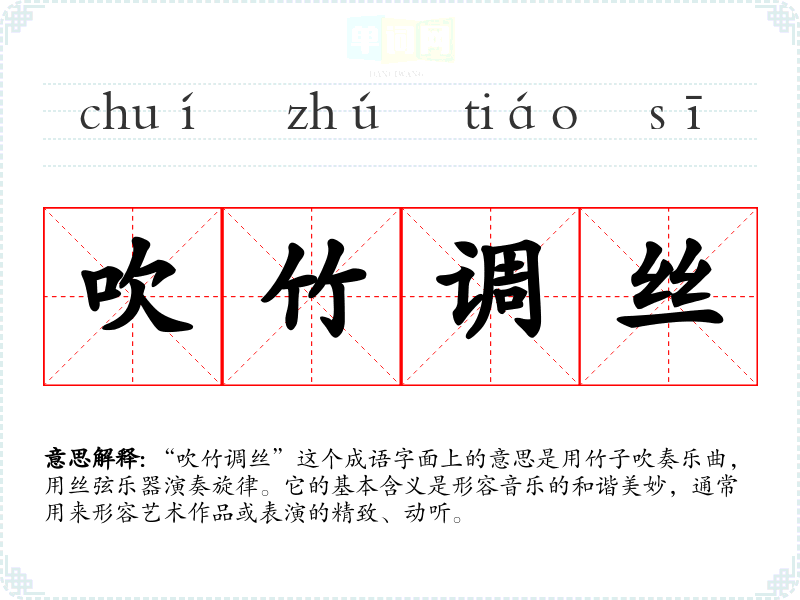 “吹竹调丝”这个成语字面上的意思是用竹子吹奏乐曲,用丝弦乐器演奏旋律。它的基本含义是形容音乐的和谐美妙,通常用来形容艺术作品或表演的精致、动听。