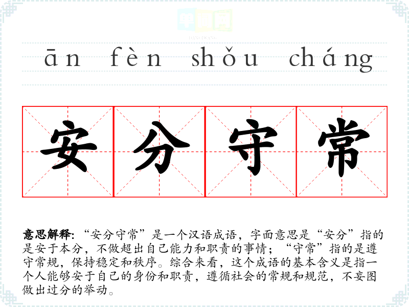 “安分守常”是一个汉语成语,字面意思是“安分”指的是安于本分,不做超出自己能力和职责的事情;“守常”指的是遵守常规,保持稳定和秩序。综合来看,这个成语的基本含义是指一个人能够安于自己的身份和职责,遵循社会的常规和规范,不妄图做出过分的举动。