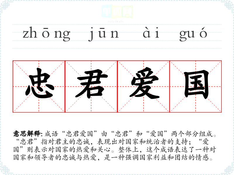 成语“忠君爱国”由“忠君”和“爱国”两个部分组成。“忠君”指对君主的忠诚,表现出对国家和统治者的支持;“爱国”则表示对国家的热爱和关心。整体上,这个成语表达了一种对国家和领导者的忠诚与热爱,是一种强调国家利益和团结的情感。