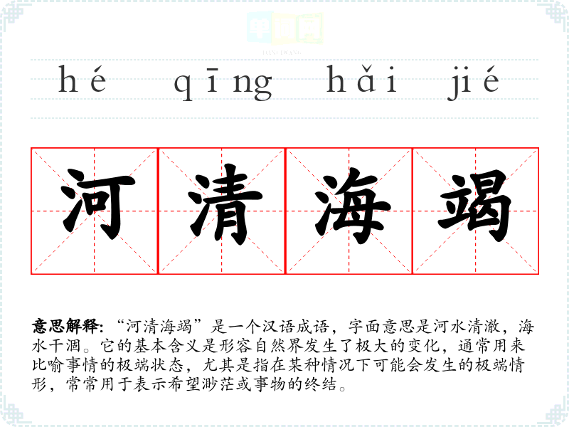 “河清海竭”是一个汉语成语,字面意思是河水清澈,海水干涸。它的基本含义是形容自然界发生了极大的变化,通常用来比喻事情的极端状态,尤其是指在某种情况下可能会发生的极端情形,常常用于表示希望渺茫或事物的终结。