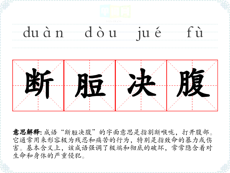 成语“断脰决腹”的字面意思是指割断喉咙,打开腹部。它通常用来形容极为残忍和痛苦的行为,特别是指致命的暴力或伤害。基本含义上,该成语强调了极端和彻底的破坏,常常隐含着对生命和身体的严重侵犯。