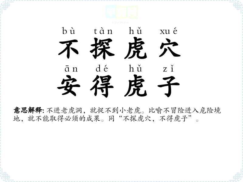 | 不探虎穴,不得虎子 | 不进老虎洞,就捉不到小老虎。比喻不冒险进入危险境地,就不能取得必须的成果。同“不入虎穴,焉得虎子”。 |