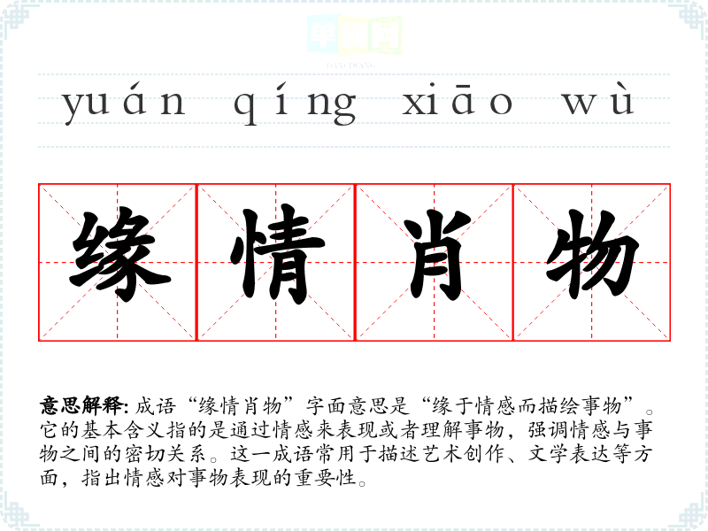 成语“缘情肖物”字面意思是“缘于情感而描绘事物”。它的基本含义指的是通过情感来表现或者理解事物,强调情感与事物之间的密切关系。这一成语常用于描述艺术创作、文学表达等方面,指出情感对事物表现的重要性。