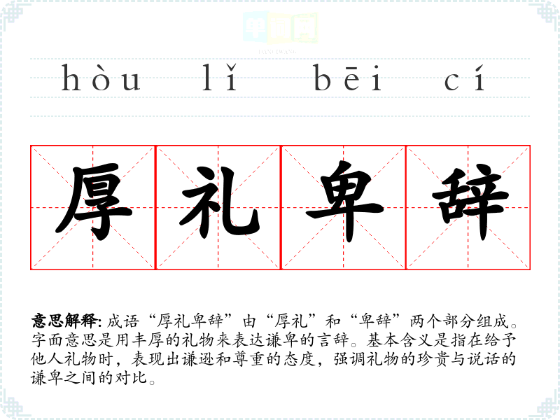 成语“厚礼卑辞”由“厚礼”和“卑辞”两个部分组成。字面意思是用丰厚的礼物来表达谦卑的言辞。基本含义是指在给予他人礼物时,表现出谦逊和尊重的态度,强调礼物的珍贵与说话的谦卑之间的对比。