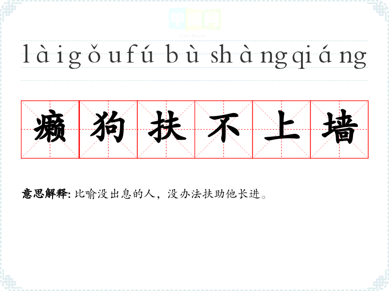 | 癞狗扶不上墙 | 比喻没出息的人,没办法扶助他长进。 |