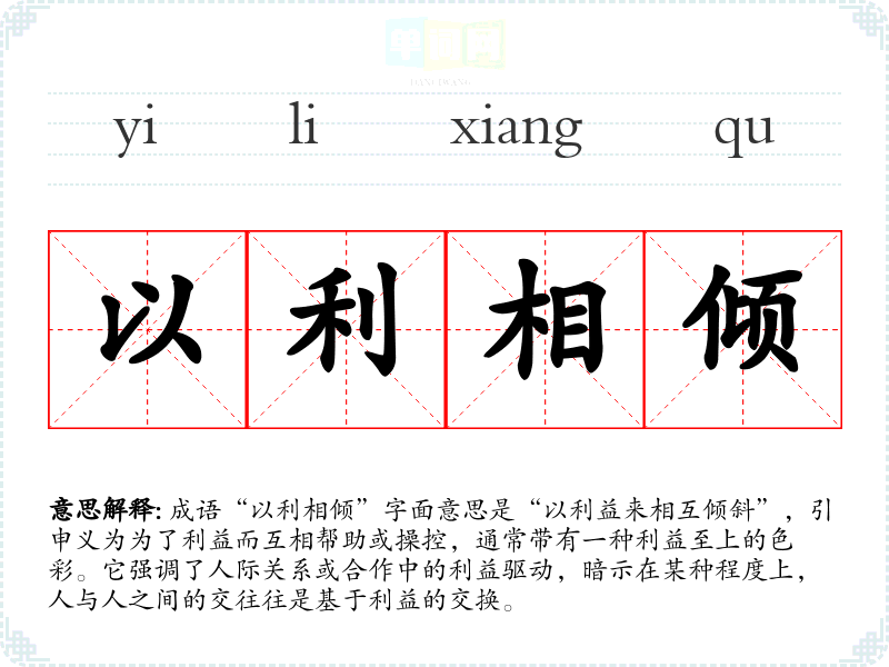 成语“以利相倾”字面意思是“以利益来相互倾斜”,引申义为为了利益而互相帮助或操控,通常带有一种利益至上的色彩。它强调了人际关系或合作中的利益驱动,暗示在某种程度上,人与人之间的交往往是基于利益的交换。