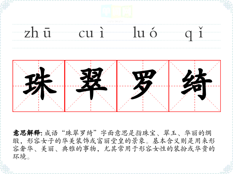 在**传统文化中,珠翠象征着财富与美,而罗绮则代表了工艺的精美。这个成语反映了古代社会对女性美的重视,以及对奢华生活的向往。在现代社会,虽然人们的价值观有所变化,但对美的追求依然存在,成语的使用仍然适用。