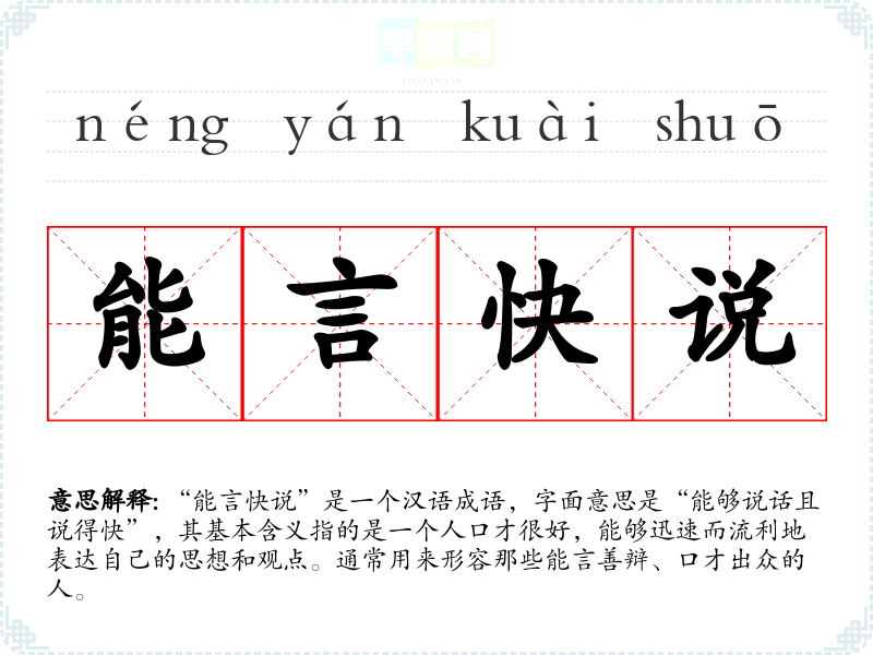 “能言快说”是一个汉语成语,字面意思是“能够说话且说得快”,其基本含义指的是一个人口才很好,能够迅速而流利地表达自己的思想和观点。通常用来形容那些能言善辩、口才出众的人。