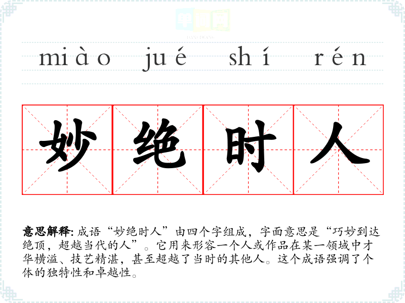 成语“妙绝时人”由四个字组成,字面意思是“巧妙到达绝顶,超越当代的人”。它用来形容一个人或作品在某一领域中才华横溢、技艺精湛,甚至超越了当时的其他人。这个成语强调了个体的独特性和卓越性。