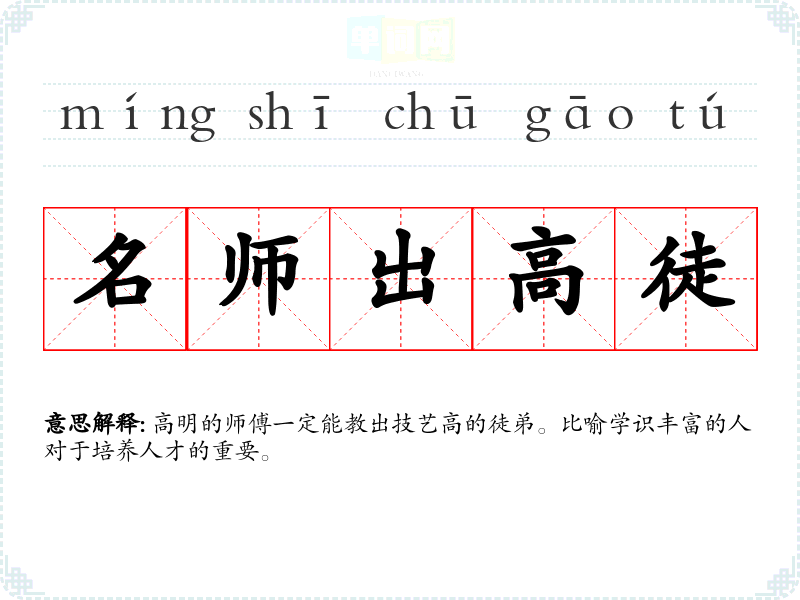 | 名师出高徒 | 高明的师傅一定能教出技艺高的徒弟。比喻学识丰富的人对于培养人才的重要。 |