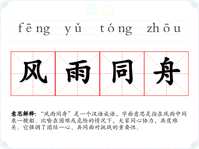 “风雨同舟”是一个汉语成语,字面意思是指在风雨中同乘一艘船。比喻在困难或危险的情况下,大家同心协力,共度难关。它强调了团结一心、共同面对挑战的重要性。