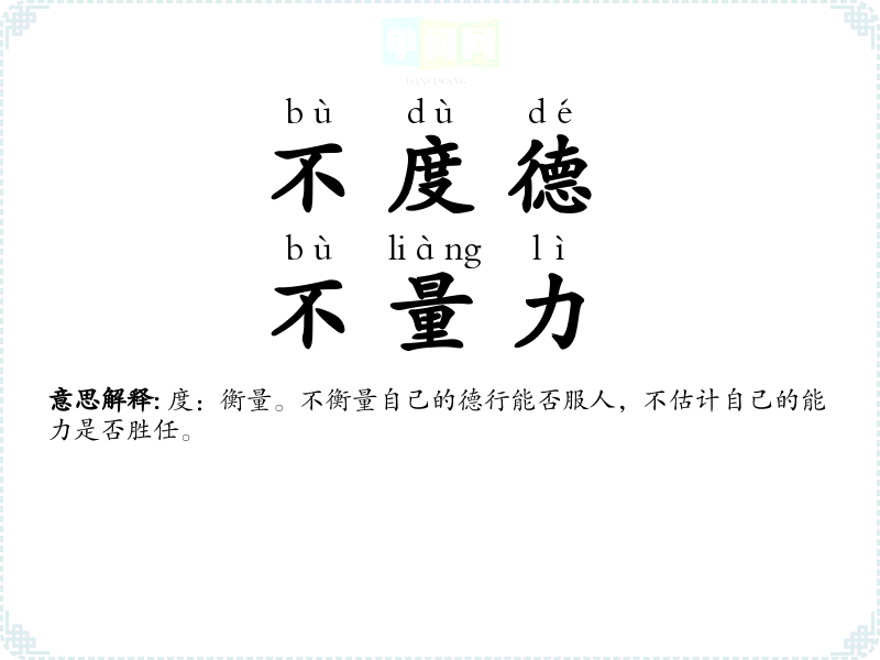 | 不度德,不量力 | 度:衡量。不衡量自己的德行能否服人,不估计自己的能力是否胜任。 |