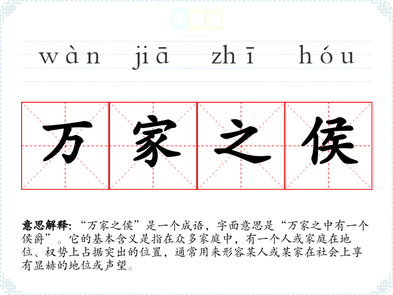 “万家之侯”是一个成语,字面意思是“万家之中有一个侯爵”。它的基本含义是指在众多家庭中,有一个人或家庭在地位、权势上占据突出的位置,通常用来形容某人或某家在社会上享有显赫的地位或声望。