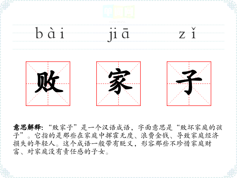 “败家子”是一个汉语成语,字面意思是“败坏家庭的孩子”。它指的是那些在家庭中挥霍无度、浪费金钱、导致家庭经济损失的年轻人。这个成语一般带有贬义,形容那些不珍惜家庭财富、对家庭没有责任感的子女。