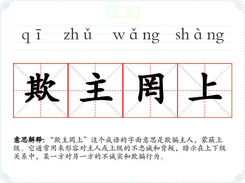“欺主罔上”这个成语的字面意思是欺骗主人,蒙蔽上级。它通常用来形容对主人或上级的不忠诚和背叛,暗示在上下级关系中,某一方对另一方的不诚实和欺骗行为。