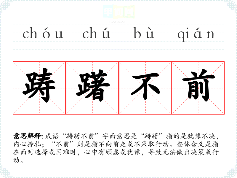 成语“踌躇不前”字面意思是“踌躇”指的是犹豫不决,内心挣扎;“不前”则是指不向前走或不采取行动。整体含义是指在面对选择或困难时,心中有顾虑或犹豫,导致无法做出决策或行动。