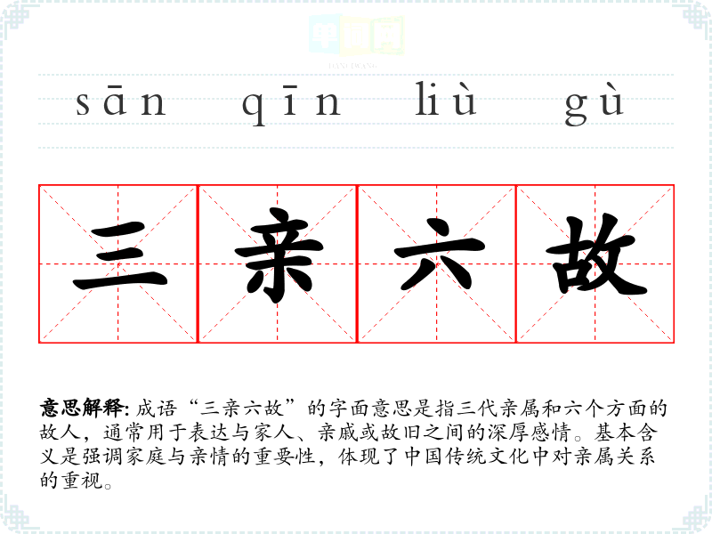 成语“三亲六故”的字面意思是指三代亲属和六个方面的故人,通常用于表达与家人、亲戚或故旧之间的深厚感情。基本含义是强调家庭与亲情的重要性,体现了**传统文化中对亲属关系的重视。