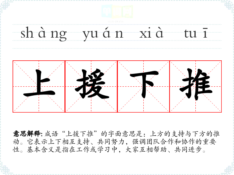 成语“上援下推”的字面意思是:上方的支持与下方的推动。它表示上下相互支持、共同努力,强调团队合作和协作的重要性。基本含义是指在工作或学*中,大家互相帮助、共同进步。