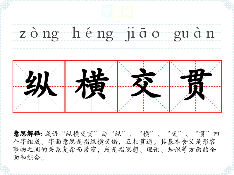成语“纵横交贯”由“纵”、“横”、“交”、“贯”四个字组成。字面意思是指纵横交错,互相贯通。其基本含义是形容事物之间的关系复杂而紧密,或是指思想、理论、知识等方面的全面和综合。