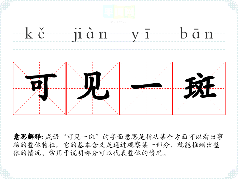 | 可见一斑 | 斑:杂色的花纹或斑点。比喻见到事物的一少部分也能推知事物的整体。 |