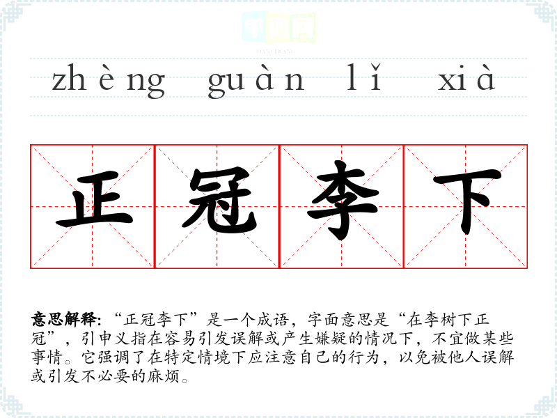 | 正冠李下 | 在李树下不整帽子,以避免偷李的嫌疑。比喻做容易引起怀疑的事。 |