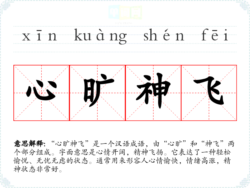 心旷神飞 犹言心境愉悦,飘飘欲仙。