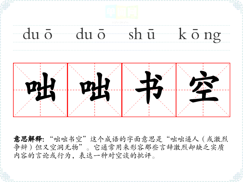 “咄咄书空”这个成语的字面意思是“咄咄逼人(或激烈争辩)但又空洞无物”。它通常用来形容那些言辞激烈却缺乏实质内容的言论或行为,表达一种对空谈的批评。