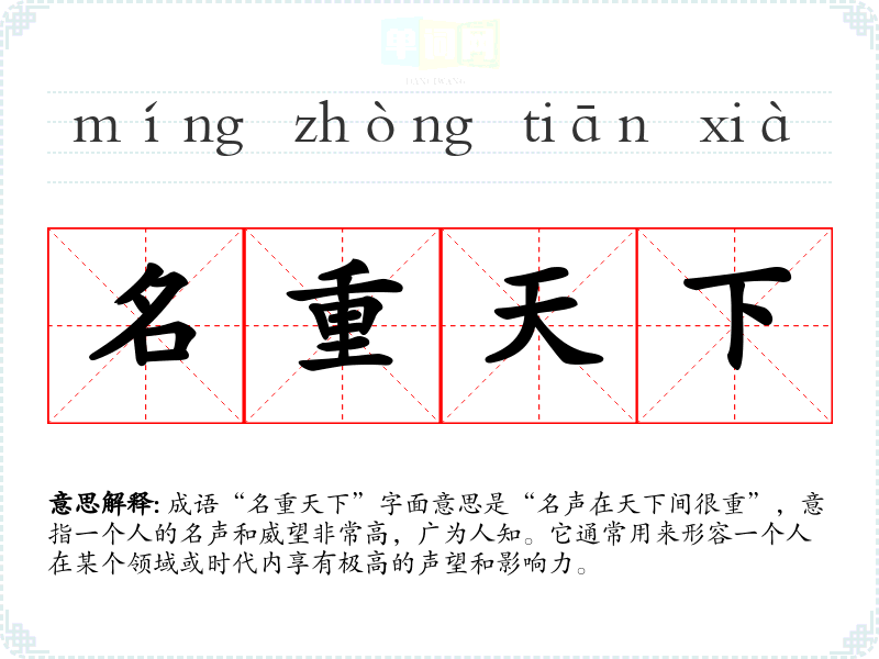 成语“名重天下”字面意思是“名声在天下间很重”,意指一个人的名声和威望非常高,广为人知。它通常用来形容一个人在某个领域或时代内享有极高的声望和影响力。