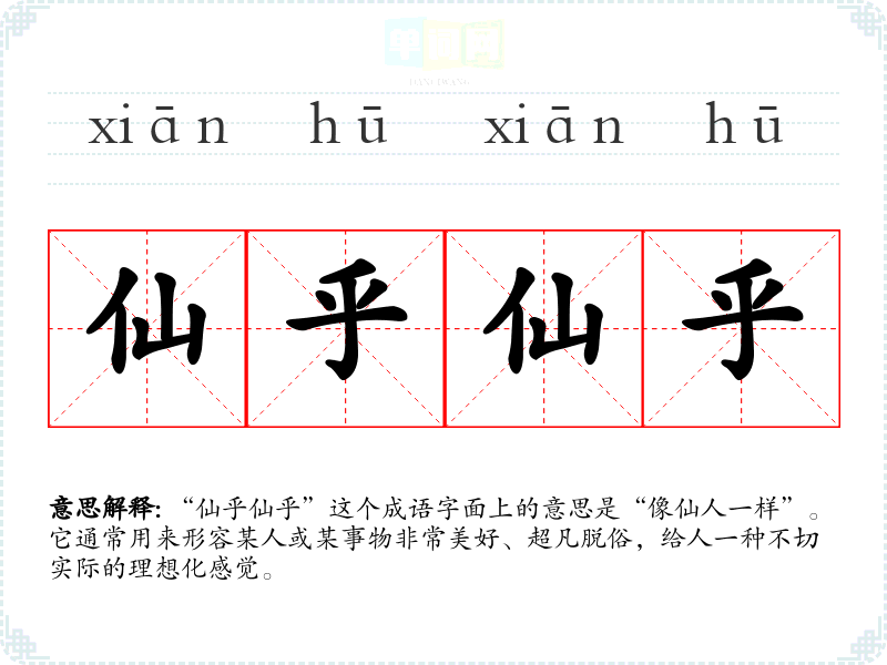“仙乎仙乎”这个成语字面上的意思是“像仙人一样”。它通常用来形容某人或某事物非常美好、超凡脱俗,给人一种不切实际的理想化感觉。