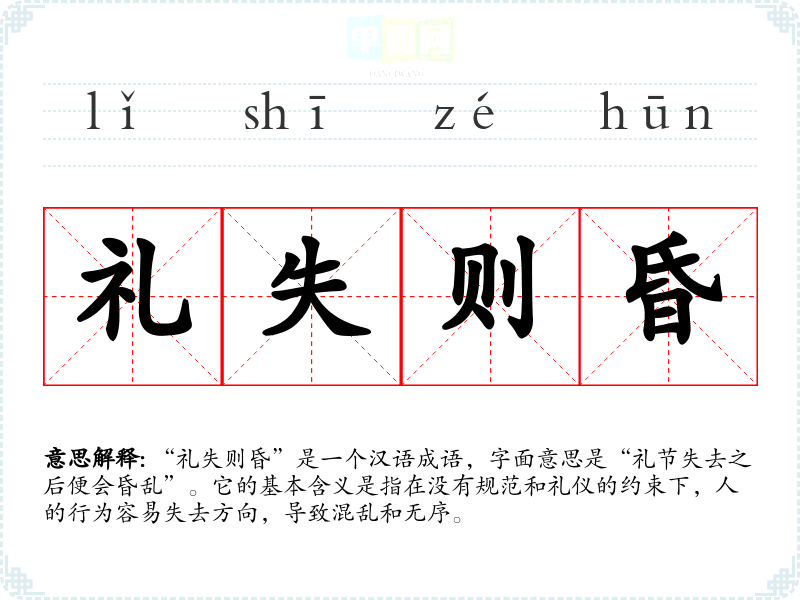 “礼失则昏”是一个汉语成语,字面意思是“礼节失去之后便会昏乱”。它的基本含义是指在没有规范和礼仪的约束下,人的行为容易失去方向,导致混乱和无序。