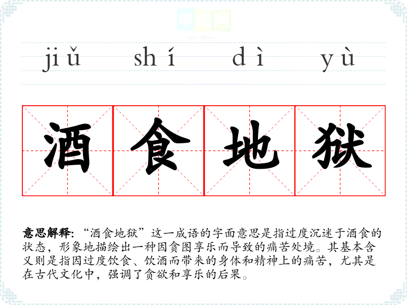 “酒食地狱”这一成语的字面意思是指过度沉迷于酒食的状态,形象地描绘出一种因贪图享乐而导致的痛苦处境。其基本含义则是指因过度饮食、饮酒而带来的身体和精神上的痛苦,尤其是在古代文化中,强调了贪欲和享乐的后果。