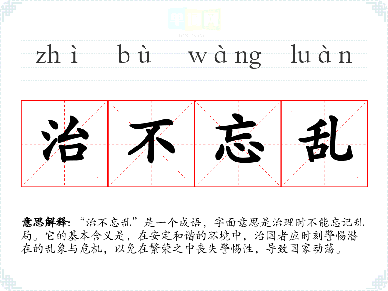 “治不忘乱”是一个成语,字面意思是治理时不能忘记乱局。它的基本含义是,在安定和谐的环境中,治国者应时刻警惕潜在的乱象与危机,以免在繁荣之中丧失警惕性,导致国家动荡。