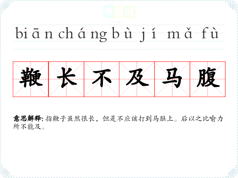 | 鞭不及腹 | 及:到。原意是鞭子虽长,也不能打马肚子。比喻相隔太远,力量达不到。 |