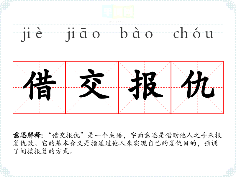 “借交报仇”是一个成语,字面意思是借助他人之手来报复仇敌。它的基本含义是指通过他人来实现自己的复仇目的,强调了间接报复的方式。