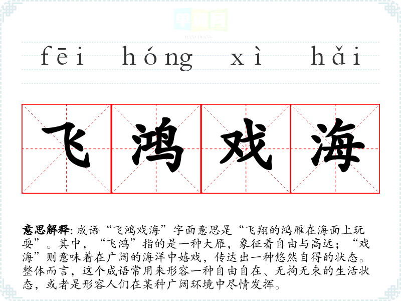 成语“飞鸿戏海”字面意思是“飞翔的鸿雁在海面上玩耍”。其中,“飞鸿”指的是一种大雁,象征着自由与高远;“戏海”则意味着在广阔的海洋中嬉戏,传达出一种悠然自得的状态。整体而言,这个成语常用来形容一种自由自在、无拘无束的生活状态,或者是形容人们在某种广阔环境中尽情发挥。