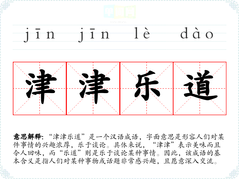 “津津乐道”是一个汉语成语,字面意思是形容人们对某件事情的兴趣浓厚,乐于谈论。具体来说,“津津”表示美味而且令人回味,而“乐道”则是乐于谈论某种事情。因此,该成语的基本含义是指人们对某种事物或话题非常感兴趣,且愿意深入交流。